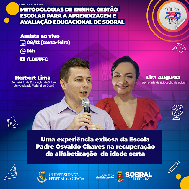 Acontecem, nos dias 08 e 09 de dezembro (sexta-feira e sábado), duas novas aulas do Curso de Formação em Metodologias de Ensino, Gestão Escolar para a Aprendizagem e Avaliação Educacional de Sobral, abordando a recuperação da alfabetização na idade certa e o papel da liderança escolar. A partir das 14h, as aulas serão transmitidas ao vivo pelo canal do Laboratório Digital Educacional no YouTube, e serão mediadas pelo secretário da Educação de Sobral, Herbert Lima.